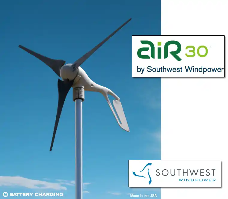 Le recomendamos el aerogenerador AIR 30 para aplicaciones de carga de baterías, tales como pequeñas cabañas y casas aisladas, casas rodantes, camping, iluminación de jardín y mucho más. El AIR 30 es un aerogenerador ideal para sistemas híbridos con energía solar. No se recomienda para uso en ambientes marinos. AIR 30 está construido y respaldado por el líder mundial en energía eólica pequeña, Southwest Windpower.
