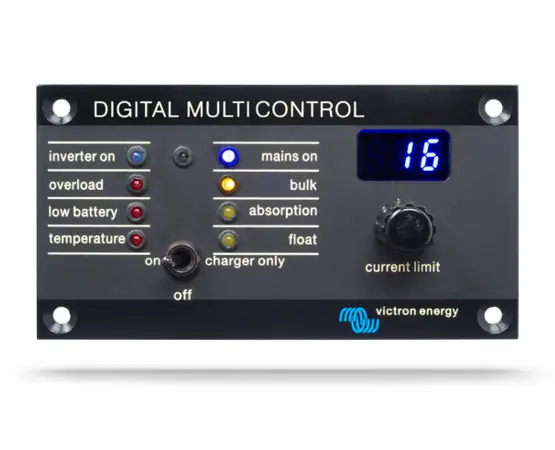 Este panel ha sido diseñado para funcionar tanto con los Victron Energy Multis como con los Quattros. Con el, PowerControl y PowerAssist pueden ajustar el límite de corriente de dos fuentes CA: el límite de corriente de un generador y el del pantalán, por ejemplo. Playa de ajuste: hasta 200 amperios. La luminosidad de los LED se reduce automáticamente durante la noche.