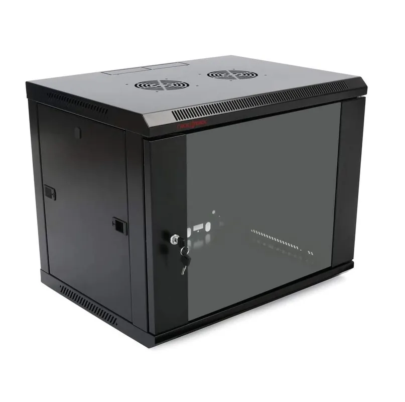 Puerta de vidrio frontal con marco de puerta sólido, cerradura pequeña; panel de metal sólido trasero; paneles laterales extraíbles con pestillos de ABS; entrada de cable superior e inferior.