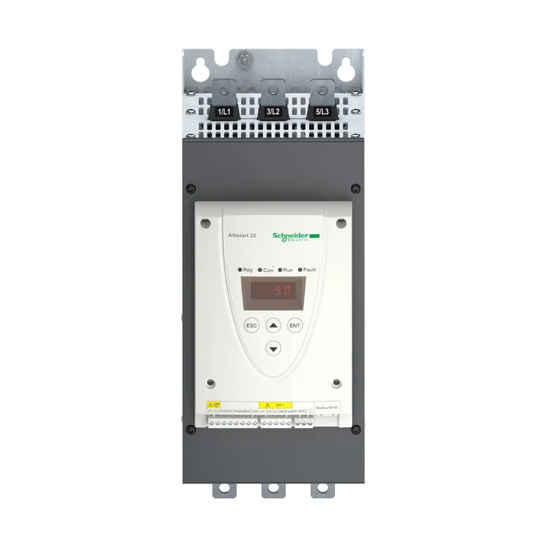 Características principalesEl arrancador suave Altistart 22 modelo ATS22D62S6 de Schneider Electric es un dispositivo compacto con bypass interno para motores trifásicos de 15–37 kW (equivalente a 62 A) en rangos de 230–600 V AC. Ofrece rampa de arranque/parada ajustables (1–60 s), limitación de corriente (~3.5×In), protección térmica del motor, supervisión de fases y detección de bloqueo. Integra comunicación Modbus (RS-485 via RJ45), tiene montaje tipo chasis IP20 (opción IP54), y cumple con normas IEC 60947-4-2, además de soportar alimentación entre 195–660 V AC