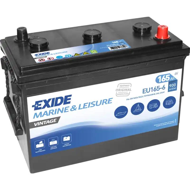 La Exide EU165-6, parte de la exclusiva línea Marina Vintage, ha sido diseñada específicamente para coches clásicos y de colección. Muchos vehículos antiguos emplean sistemas eléctricos de 6V con baterías de 3 vasos, por lo que necesitan un suministro confiable de energía con una gran capacidad de arranque.