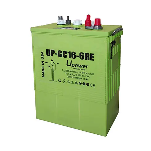 La Batería UPower 6V 550Ah UP-GC16-6RE es de alto rendimiento diseñada para uso de forma específica abarcando las áreas de Energía Solar, sobretodo aplicaciones en energía solar fotovoltaica. La Batería UPower 6V 550Ah UP-GC16-6RE, es de ciclo profundo, ofrece una construcción con plenas garantías de funcionamiento mediante placas positivas doblemente aisladas que eliminan la posibilidad de desalineación o grietas en los separadores, bifurcaciones o cortocircuitos en el fondo o lados. Cada celda tiene niveles incrementados de reserva de líquido, para menores intervalos de «riego”. Sus resistentes placas permiten una larga vida de servicio.