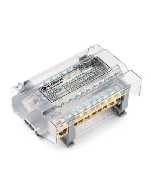 El bloque de terminales de distribución de cuatro polos Cabur QBLOK4160S es ideal para aplicaciones de distribución eléctrica. Con un diseño robusto y características prácticas, este dispositivo garantiza una conexión segura y eficiente para sistemas eléctricos industriales y comerciales.