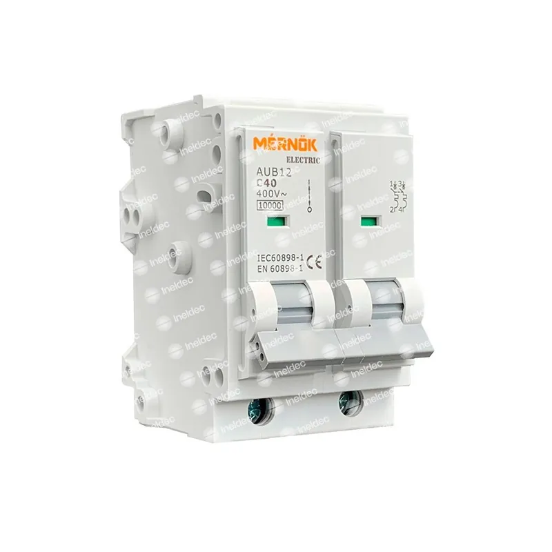 Breaker Bipolar 2×40 enchufable. Cuenta con 2 polos, una capacidad nominal de 40 amperios, poder de corte de 10kA, voltaje de 400V, tipo de corriente AC.