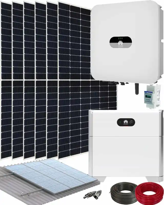 El Kit Autoconsumo Huawei 3680W 18500Whdia se trata de un sistema de autoconsumo de gran rendimiento y a muy bajo coste. Este kit de conexión a red incorpora una batería de litio de alto voltaje de Huawei, avanzada monitorización de la producción, su inversor incluye 2 maximizadores MPPT y todo ello con la mejor garantía de fiabilidad, ya que el inversor y batería tienen 10 años de garantía. Mediante este sistema de Huawei podremos tener un sistema completo de autoconsumo para poder almacenar el excedente de la producción solar. En horario de menor producción o por la noche, podremos hacer uso de la energía almacenada para reducir nuestra dependencia energética. Si lo necesitáramos, se podría ampliar la capacidad de la batería con más módulos. Se incluye también un vatímetro que se encarga de medir la energía que demandamos para nuestro consumo y para la recarga de la batería y así no verter el excedente de producción a la red si así lo deseamos No requiere de mantenimiento en ninguno de sus componentes y están incluidos todos los elementos necesarios para poner la instalación en marcha, incluido el cableado y las estructuras para los paneles solares.