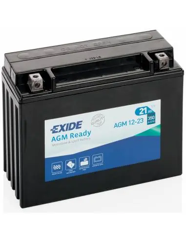La batería Exide Ready AGM AGM12-23 12V 21Ah es apta para las condiciones climáticas más extremas. La construcción con tecnología AGM (ácido inmovilizado en las celdas) y el separador de fibra de vidrio es la mejor opción para un rendimiento fiable en motocicletas, motos acuáticas y una amplia gama de vehículos de ocio.