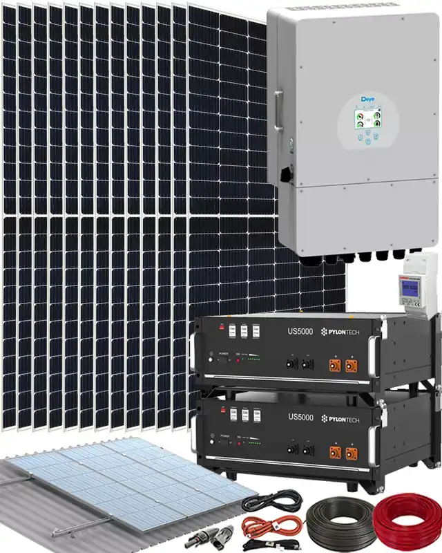 El Kit para Poner Placas Solares en Casa con Inversor Deye 8000W está diseñado para instalaciones residenciales con almacenamiento en batería. Incluye 16 paneles solares de 500W con tecnología N.Tyoe TOPCon de alta eficiencia, inversor híbrido monofásico de 8 kw con funciones de respaldo. Dos Baterías de litio de 48 V para la acumulación de excedentes. Este kit también incluye cableado y conectores, así como cuatro estructuras coplanares perfectas para una instalación sobre cubiertas. El Kit para Poner Placas Solares en Casa con Inversor Deye 8000W es perfecto para instalarse en tu vivienda y ahorrar energía.