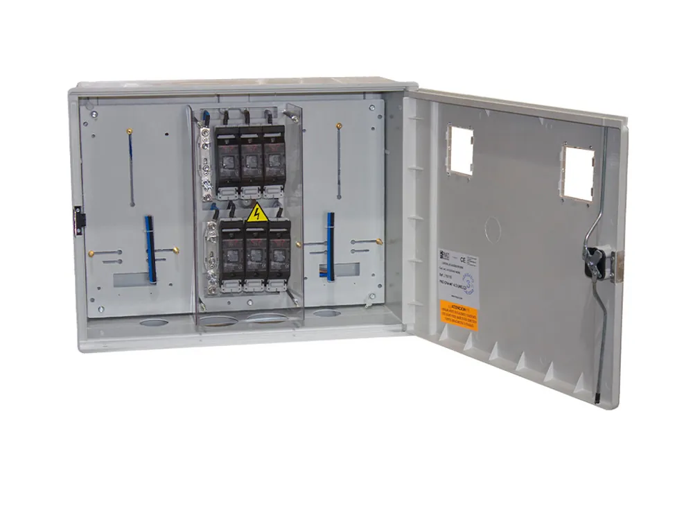 - Armario de poliéster modelo PNZ-3 2 ML T1B 3P con una mirilla 120×120, cierre triángulo de tres puntos y dispositivo candado. Preparado para alojar dos contadores trifásicos.