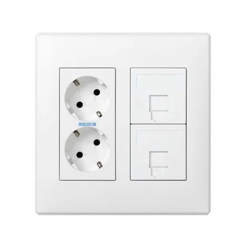 Información sobre Kit caja pared de superficie o empotrar para 2 elementos dobles con 1 enchufe doble, 2 placas para 1 RJ45 blanco Simon 500 Cima