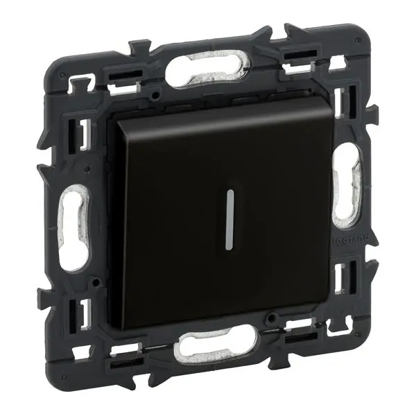 Conmutador luminoso Valena Next 10 AX – 230 V~. Bornes automáticos. Función luminoso con lámpara LED (230 Vca – 0,15 mA) referencia 0 676 86 y función piloto con lámpara LED (230 Vca – 3 mA) referencia 0 676 85, dark. Los mecanismos para iluminación Valena Next se suministran con frontal de acabado para equipar con placas embellecedoras, montaje con tornillos o garras.