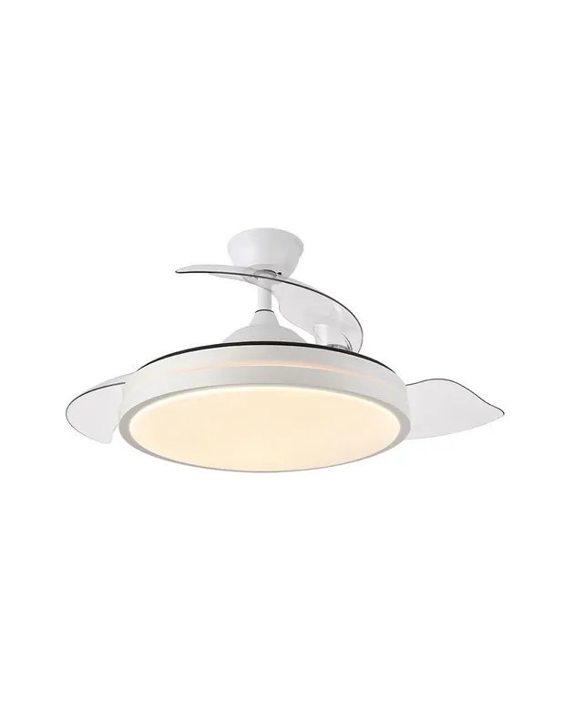 Ventilador DC de la serie ESCORPION realizado en metal, policarbonato y ABS, en color BLANCO con tres aspas DESPLEGABLES de ABS transparente muy resistentes. De diseño innovador, ideal para completar tanto en decoraciones modernas como clásicas, realizando tanto la función de lámpara como de ventilador.