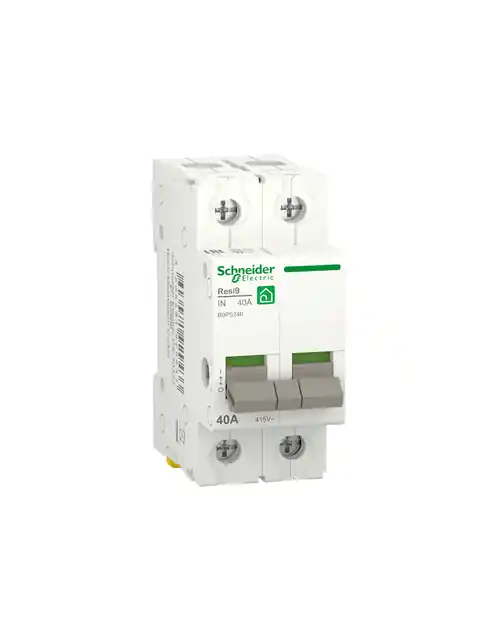 El interruptor-seccionador Resi9 es un producto excepcional. Fabricado con una configuración de 2 polos, controla y desconecta eficazmente los circuitos eléctricos, garantizando protección contra sobrecargas y cortocircuitos.