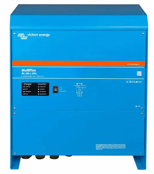 The Victron MultiPlus 48V/20000VA is a powerful and very reliable inverter with charger that combines several important functions in one device.