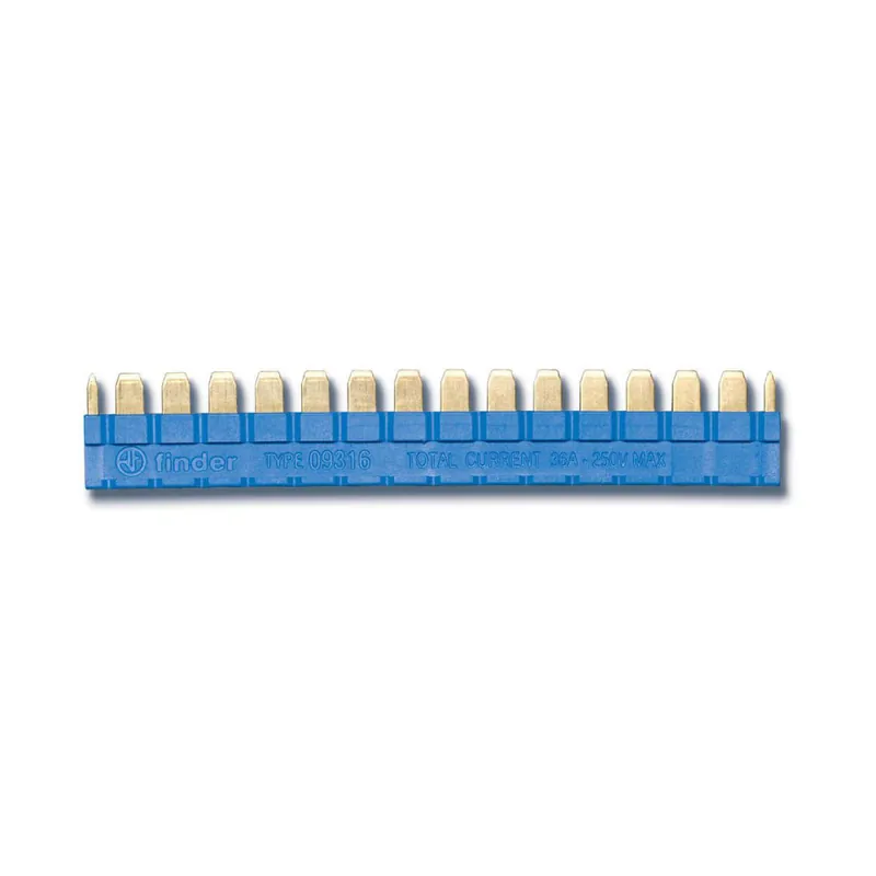 Características principalesPuente de 16 terminales de la serie 93 de Finder, diseñado para conectar múltiples contactos de relés de la serie 39. Este puente facilita la interconexión de los terminales de los relés, permitiendo configuraciones personalizadas y simplificando el cableado en aplicaciones comerciales e industriales.