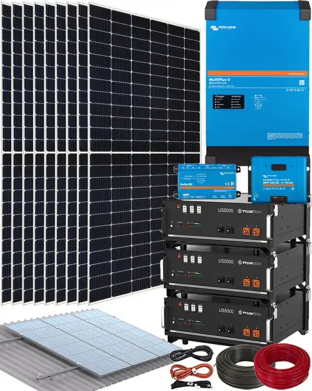 El Kit Solar Aislada Victron 5000W 48V 25000Whdia es un kit de energía solar aislada de alto rendimiento para uso doméstico o comercial. El kit está diseñado para proporcionar energía a una instalación aislada con hasta 25000Whdia de producción combinando la fiabilidad y durabilidad de un inversor Victron con un Regulador MPPT Victron y almacenamiento en baterías de litio Tensite, para poder alimentar consumos propios de una vivienda, un pequeño negocio etc… Este kit viene con todos los cables de comunicación necesarios para poder monitorizar el sistema en tiempo real desde su centro de comunicaciones Cerbo GX, y conocer así el estado de su instalación en cada momento.