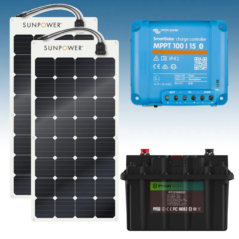 Kit Solar de 2 Placas Semiflexible SunPower de 100Wp, regulador Victron Energy SmartSolar MPPT 100/15 y Batería de Litio Pylontech 12V 100Ah, especial para barcos y caravanas