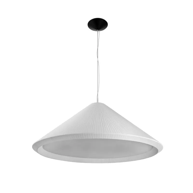 Esta luminaria tiene una original pantalla elaborada con cintas, creando una ilusión óptica de pantalla compacta.