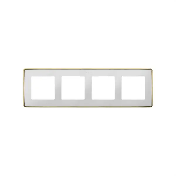 Marco para 4 elementos blanco base oro Simon 82 Detail Select. Dentro de la serie Simon 82 Detail encontramos artículos con tanto estilo como este marco para 4 elementos con acabado en blanco y base de oro. Es la sofisticación hecha marco y pertenece, como no podía ser de otro modo, a la gama Select. Esta gama incluye piezas elaboradas en materiales nobles que encajan en cualquier espacio. El marco, que es apto para empotrar, ha sido diseñado para dotar de personalidad aquella estancia en la que se instale. Tiene unas dimensiones de 93x306mm. La base está fabricada en Zamak y el marco, en plástico termoestable. Ambos materiales configuran un artículo que puede combinarse con una tapa o tecla con acabado en blanco para un óptimo resultado. En cuanto a su limpieza, lo mejor es usar un paño suave y seco y evitar los limpiadores abrasivos que contengan cloro, ya que podrían dañar su superficie.