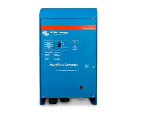Se trata de un inversor-cargador para baterías de 24 voltios. Es el más pequeño de la marca Victron de la gama Compact Multiplus. Con una potencia de salida de800W y un pico de potencia de 1600W para soportar momentaneamente los arranques de motores, este inversor-cargador es ideal para pequeñas instalaciones en casetas de campo, caravanas o en barcos. Viene incorporado con un cargador de 4 etapas de corriente máxima de 16 A. Conmutador de transferencia de CA de alta velocidad capaz de suministrar cargas en caso de fallo de suministro eléctrico sin que la carga perciba el cambio. Válido para todo tipo de baterías de 24 voltios con fácil programación mediante interruptores DIP internos.