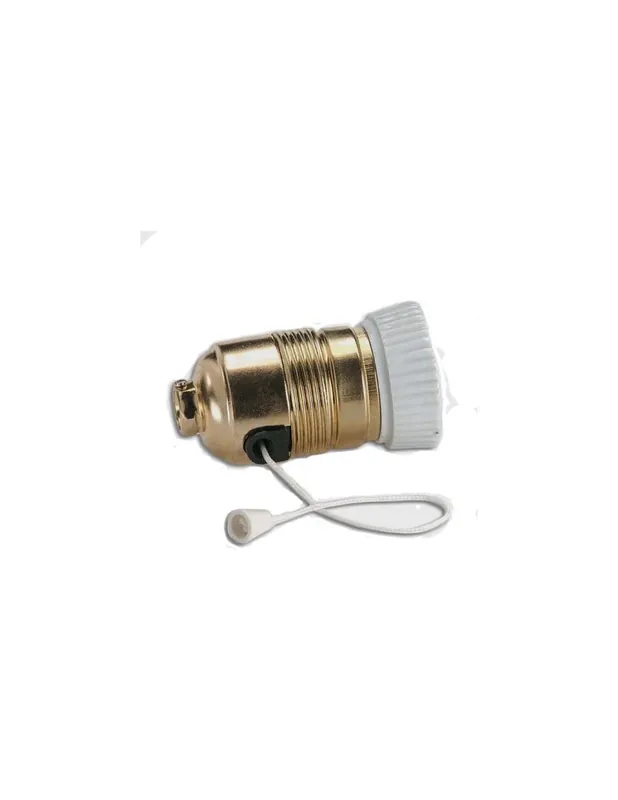 Portalámparas fabricado en metal dorado con una arandela de porcelana, indicado para sustituir portalámparas antiguos o para fabricar lámparas o articulos de decoración. Este portalamparas incluye un cordel que enciende o apaga la lámpara.