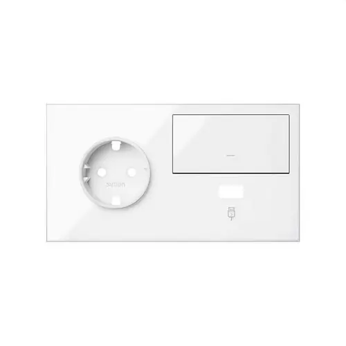 Ordenar Ahora Mismo Kit front para 2 elementos con 1 base de enchufe schuko, 1 tecla y 1 cargador USB izquierda blanco brillante Simon 100