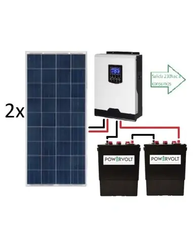 Un ejemplo de instalación aislada que se podría suministrar con este kit con un consumo medio diario de unos 700Wh/día sería (en verano el consumo se podría llegar a duplicar, ya que la producción solar se duplica):