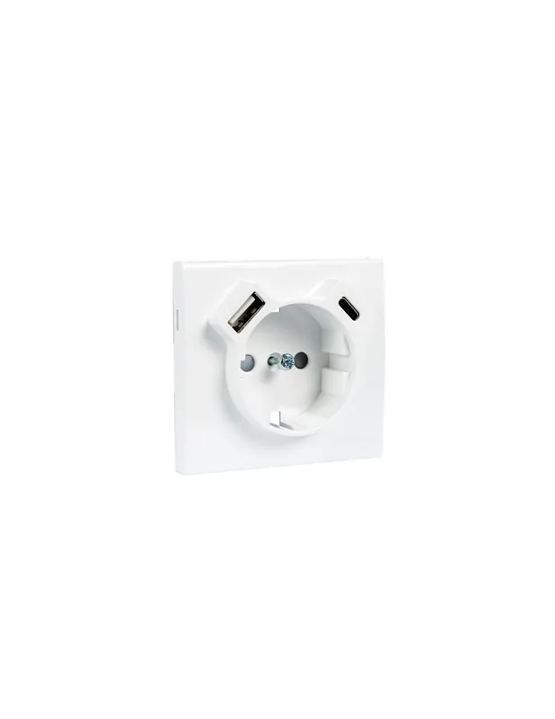 El mecanismo permite conectar dispositivos mediante enchufe schuko tradicional y puerto USB simultáneamente. La base blanca se adapta a cualquier decoración interior sin llamar la atención.