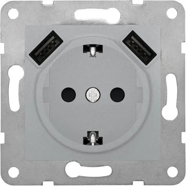 Base de enchufe Schuko con doble cargador USB en color plata luna de la serie Viva. Este enchufe permite conectar dispositivos con toma Schuko® y a la vez cargar de forma rápida dispositivos de 5Vdc como Smart Phones, tablets o powerbanks. Enchufe: 250Vac 16A, embornamiento sin tornillo. Cargador USB: 2 x 5Vdc, 100-250Vac, protección contra cortocircuito. El doble cargador de USB dispone de protección de sobretemperatura y sobrecarga. Disponible en la mayoría de las series y acabados de BJC y Siemens DELTA.