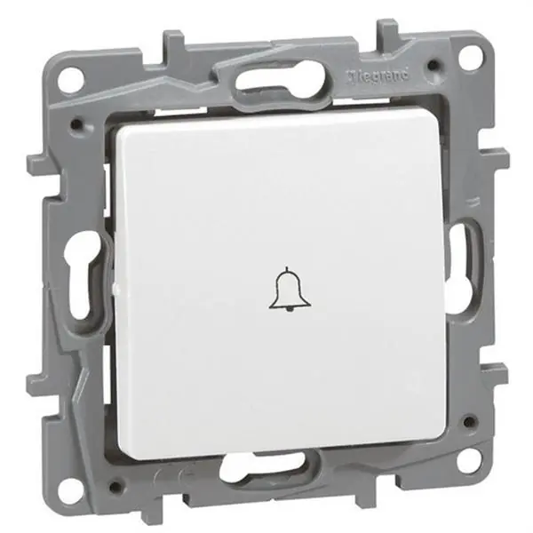 Pulsador luminoso NILOE 6A 250V blanco. Pulsadores 6 A – 250 V~ Pulsador luminoso con etiqueta pictogramas – NA – NC – Incluye Lámpara LED ref. 6 650 90 y etiquetas picto «campana, «candado» y «bombilla» integrados. Niloé – pulsadores – El mecanismo incluye embellecedor y soporte – Para equipar con placas embellecedoras – Montaje de los mecanismos empotrados o en superficie – Fijación con tornillo o garras con accesorios garras ref. 6 650 99 – Se suministra con protector.