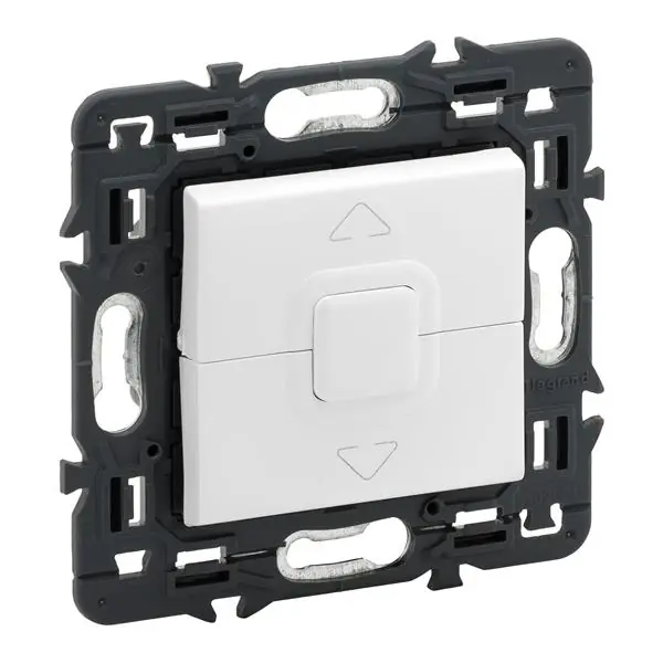 Pulsador para persianas Valena Next 6 A. Bornes automáticos, enclavamiento mecánico, blanco. Los mecanismos para persianas, interruptores de tarjeta para habitación de hotel y termostatos Valena Next se suministran con frontal de acabado para equipar con placas embellecedoras, montaje con tornillos o garras.