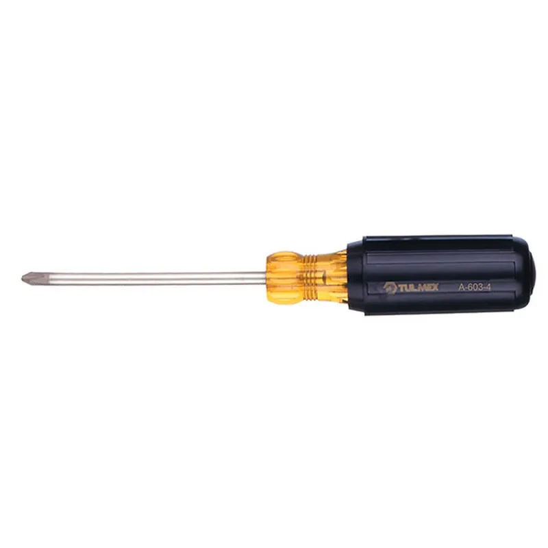 Características principales«El mango Cushion-Grip™ proporciona mayor torsión y comodidad. Las bridas integrales dentro del mango brindan un anclaje firme de la barra, resistente a la torsión. Barras con tratamiento térmico especial. Punta maquinada a precisión para proporcionar un ajuste preciso. Cromado de calidad superior para lograr un contacto uniforme y resistencia a la corrosión. El casquillo patentado Tip-Ident identifica rápidamente el tipo de desarmador y la orientación de la punta del desarmador. Satisface o supera las especificaciones de ASME/ANSI aplicables. Punta Phillips n.º 2 con barra redonda de 4».»