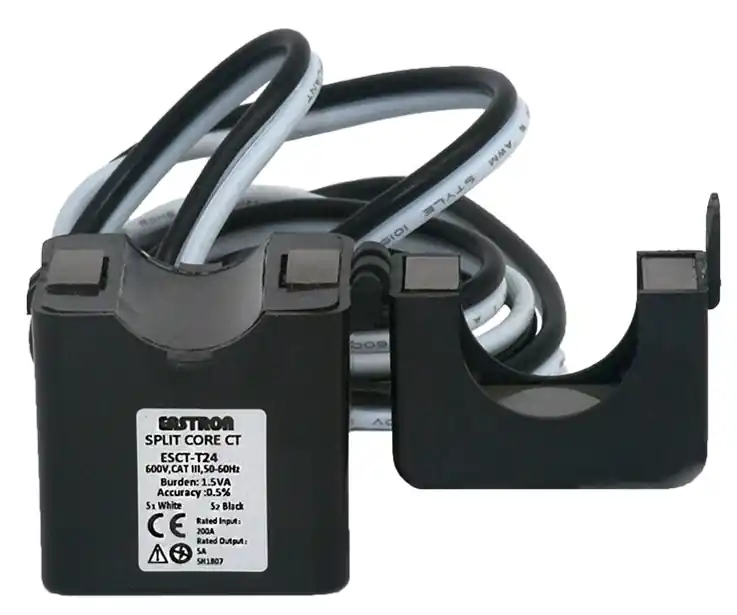 Sensor de corriente toroidal CT-ESCT-T24 de 200A es necesario para la medición de consumo indirecto con los vatímetros Eastron. Será necesario un sensor de corriente por fase, por tanto en una instalación monofásica será necesario un solo sensor mientras que en una instalación trifásica serán necesario 3 sensores.