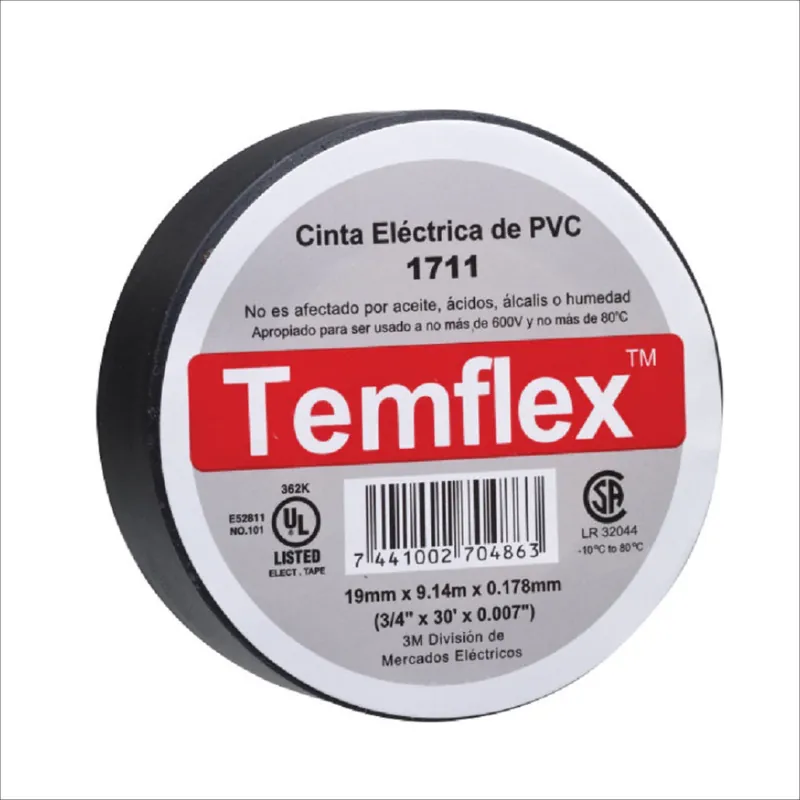 Características principalesLa Cinta Eléctrica de PVC 3M™ Temflex™ 165 es una cinta aislante de vinilo multiuso de buena calidad. Tiene gran resistencia a la humedad y a las condiciones climáticas variables. Es una cinta de cloruro de polivinilo (PVC) ignífuga y adaptable. La cinta 3M Temflex 165 proporciona una gran protección mecánica con un volumen mínimo. Es una cinta aislante certificada por CSA y listada por UL. No se utilizan solventes en el proceso de fabricación.