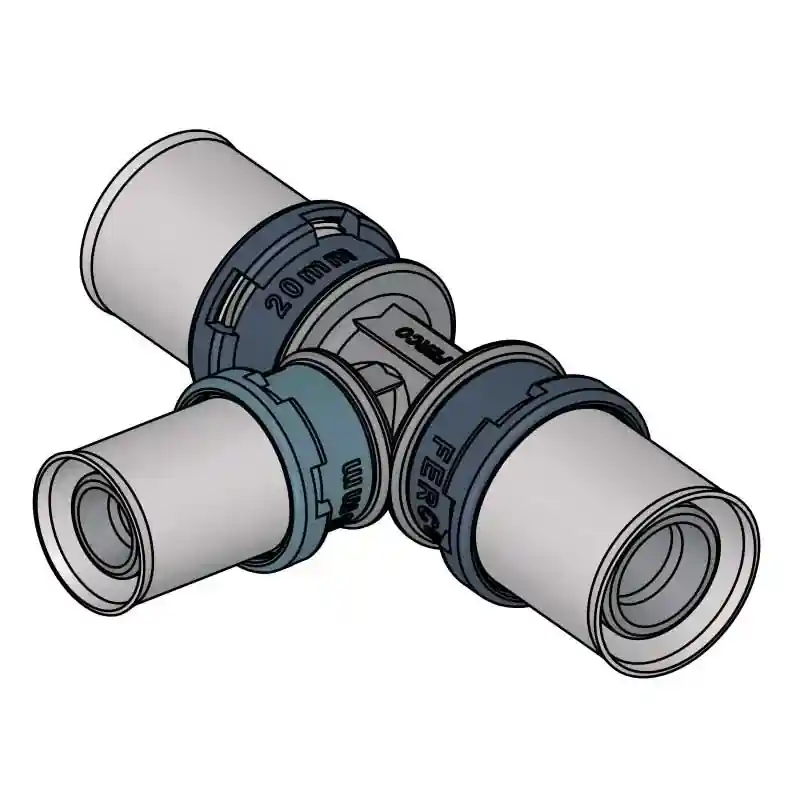 El Te Reducida Press Fitting FERCO Ø 25-16-20 es una solución de alta calidad para instalaciones de aire, agua caliente sanitaria (ACS) y calefacción. Fabricada en tecnopolímero PVDF, esta pieza garantiza un rendimiento óptimo en diversos sistemas gracias a sus propiedades técnicas avanzadas y diseño funcional.