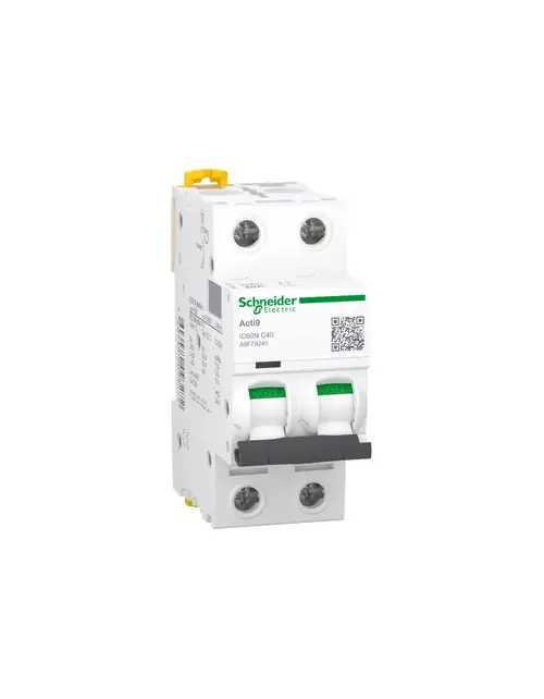 Nuestro producto, el Acti9 iC60N, es un disyuntor miniatura de bajo voltaje (MCB). Es un interruptor 2P de 2 polos protegidos, equipado con una corriente nominal de 40A y una curva de disparo de categoría C.