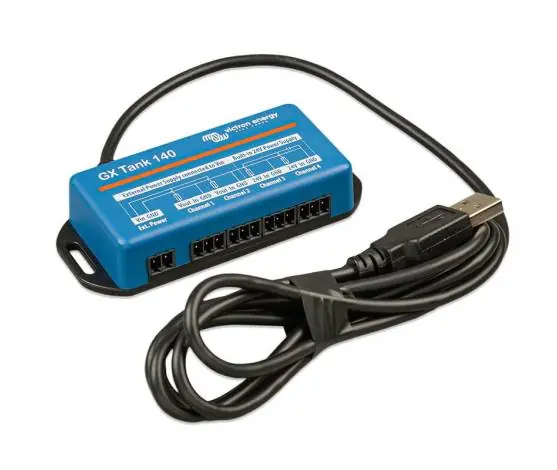 El GX Tank 140 es un accesorio de la línea de productos de monitoreo del sistema GX de Victron, que permite leer hasta cuatro sensores de nivel de tanque. Estas lecturas pueden ser accedidas tanto localmente en el sistema como remotamente a través del VRM Portal de Victron.