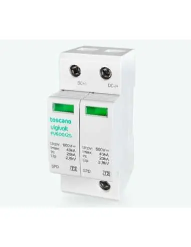 El Protector de sobretensiones transitorias Toscano DC 1200 V pertenece a una serie de protectores para sistemas fotovoltaicos que han sido desarrollados para proteger contra descargas y sobretensiones producidas por impactos de rayos en la parte de continua en dichos sistemas.