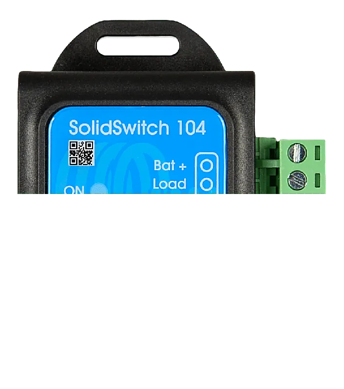 El Victron SolidSwitch 104 conmuta cargas de CC de hasta 70 V/4 A y puede controlarse mediante una señal digital de baja potencia. Tiene tres casos de uso típicos: