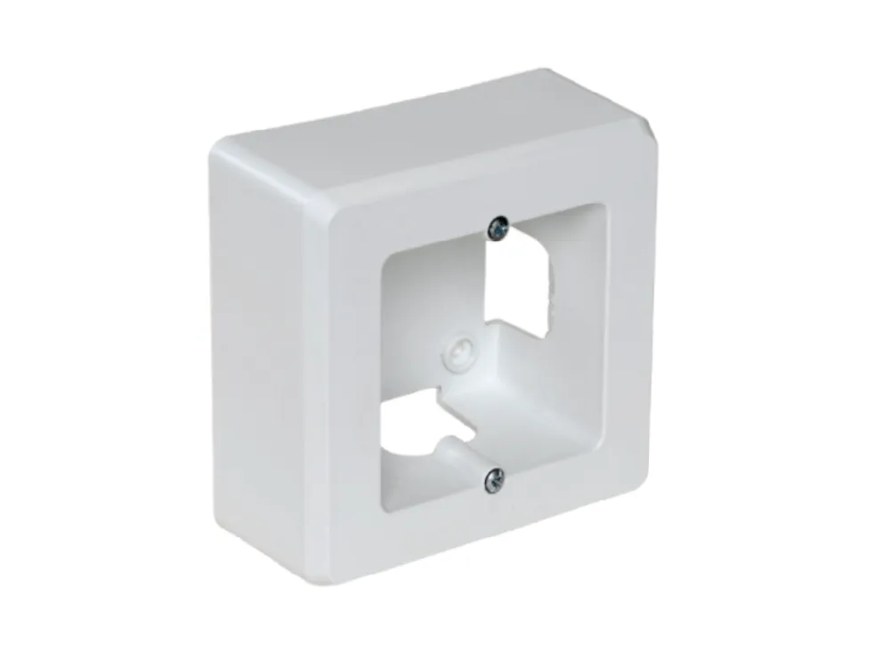Caja de mecanismos de superficie. Para 1 elemento. Color blanco. Dimensiones exteriores 94 x 96 x 43 mm. Incluye taco y tornillo. Entradas para canales 10×16, 10×20, 16×25 y 25×40 mm.